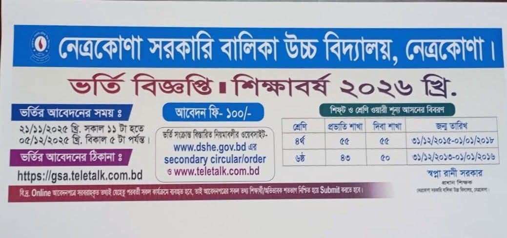 ৪র্থ ও ৬ষ্ঠ শ্রেণিতে ভর্তি বিজ্ঞপ্তি। শিক্ষাবর্ষ -২০২৬